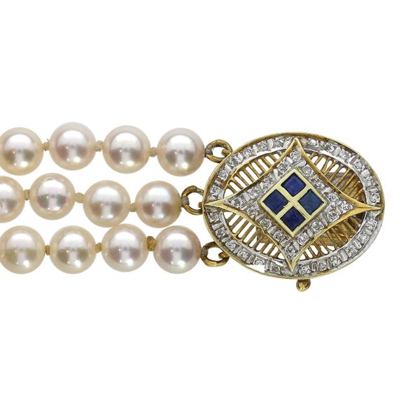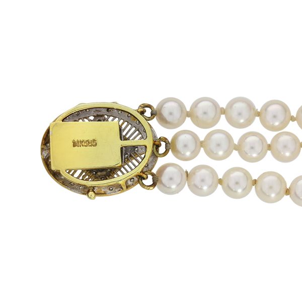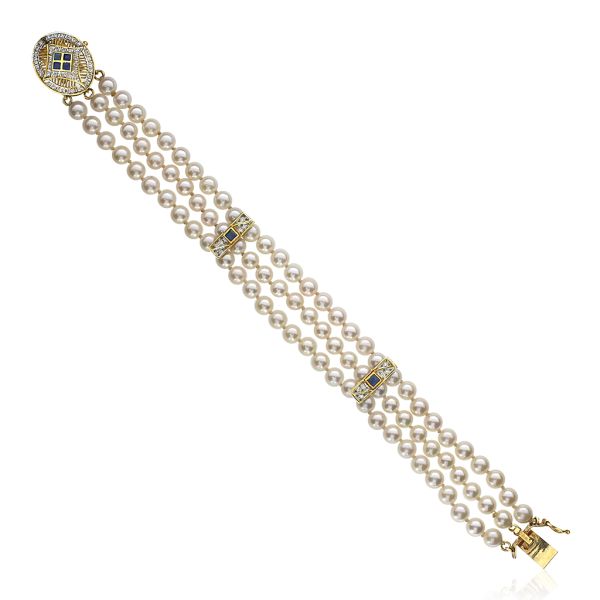 Vintage 14K 3 Strand Pearl Bracelet with Diamond and Blue Sapphire Accents