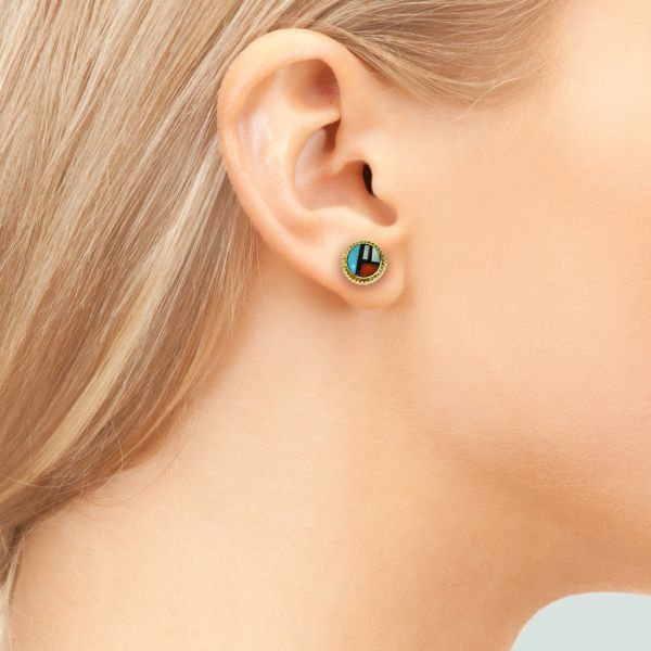 Vintage 14K Yellow Gold Native American Turquoise, Coral and MOP Inlay Stud Earrings Image 4 Purple Creek Holly Springs, NC