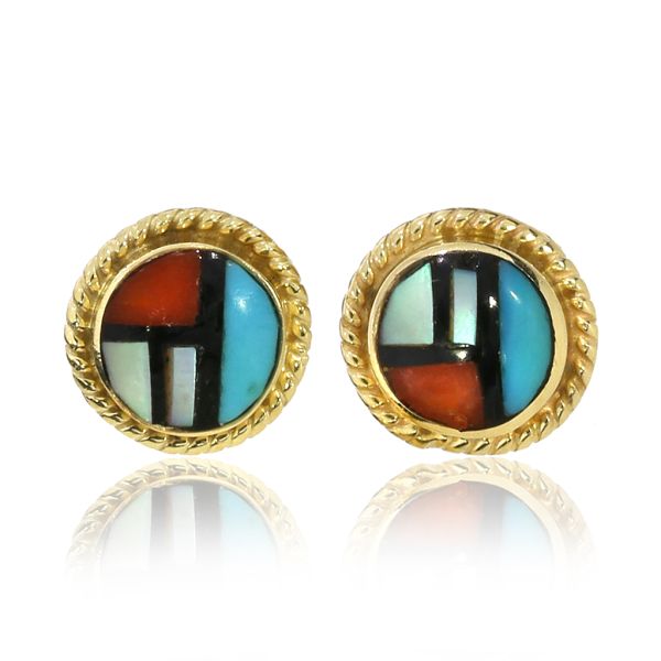 Vintage 14K Yellow Gold Native American Turquoise, Coral and MOP Inlay Stud Earrings Image 2 Purple Creek Holly Springs, NC
