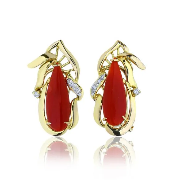 Vintage 14K Yellow Gold Red Coral and Natural Diamond Earrings Image 2 Purple Creek Holly Springs, NC