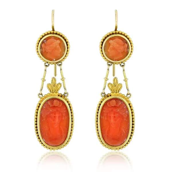 Vintage 18K Yellow Gold Coral Cameo Dangle Earrings Image 2 Purple Creek Holly Springs, NC