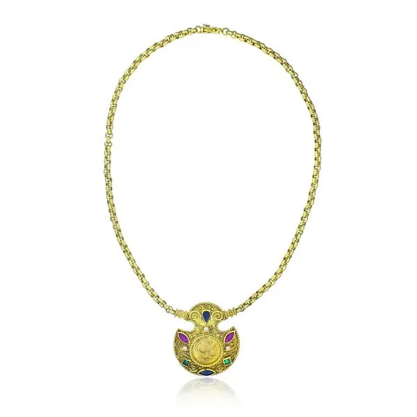 18K Yellow Gold 17" Greek Necklace and Pendant with Natural Diamonds Sapphires Ruby and Emerald