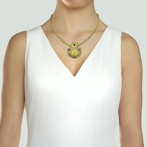 18K Yellow Gold 17" Greek Necklace and Pendant with Natural Diamonds Sapphires Ruby and Emerald