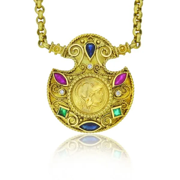 18K Yellow Gold 17" Greek Necklace and Pendant with Natural Diamonds Sapphires Ruby and Emerald Image 2 Purple Creek Holly Springs, NC