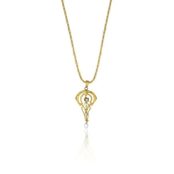 Art Nouveau 18K Yellow Gold Natural Diamond & Pearl Pendant Necklace