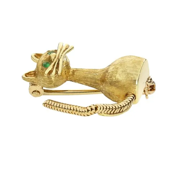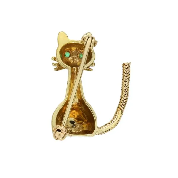 14K Yellow Gold Cat Brooch with Articulated Tail and Emerald Eyes Image 2 Purple Creek Holly Springs, NC