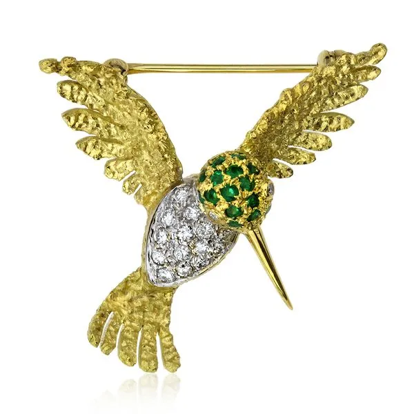 18K Yellow and White Gold Emerald & Natural Diamond Figural Hummingbird Brooch Purple Creek Holly Springs, NC