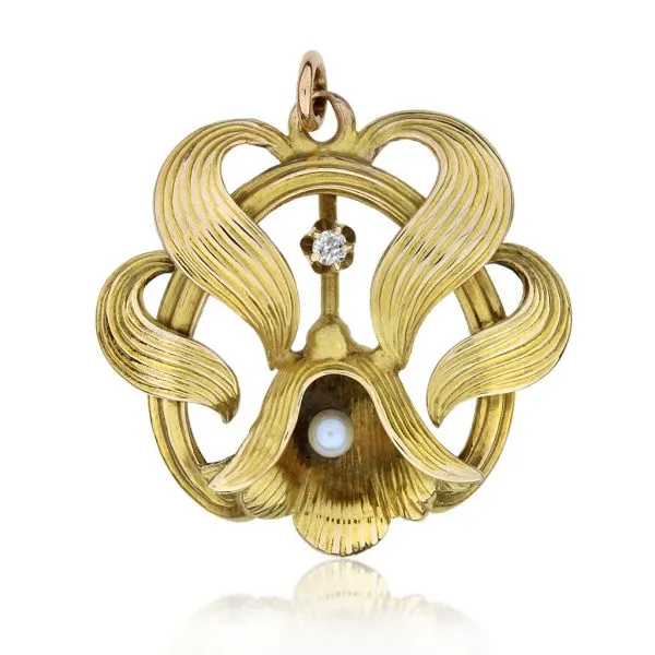 Art Nouveau 14K Yellow Gold Flourish Natural Diamond Pendant