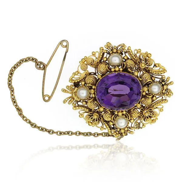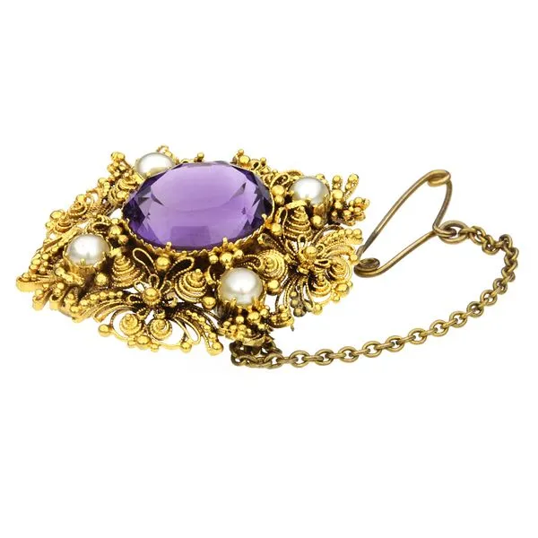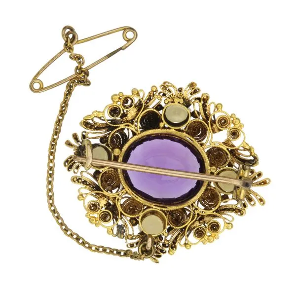 Vintage 18K Yellow Gold 5.87ct Amethyst & Pearl Filigree Brooch with Safety Pin Image 2 Purple Creek Holly Springs, NC