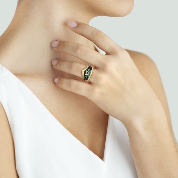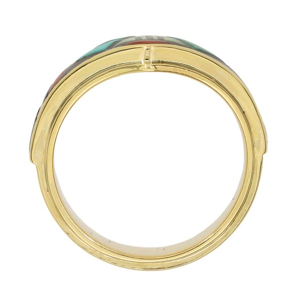 14K Yellow Gold Tim Bedah Signed Native American Turquoise, Coral and MOP Inlay Ring Image 3 Purple Creek Holly Springs, NC