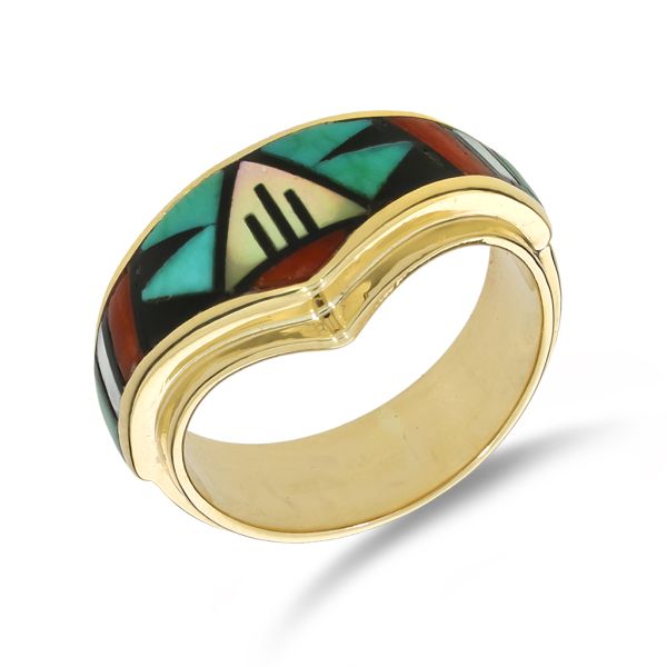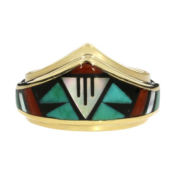 14K Yellow Gold Tim Bedah Signed Native American Turquoise, Coral and MOP Inlay Ring Image 2 Purple Creek Holly Springs, NC
