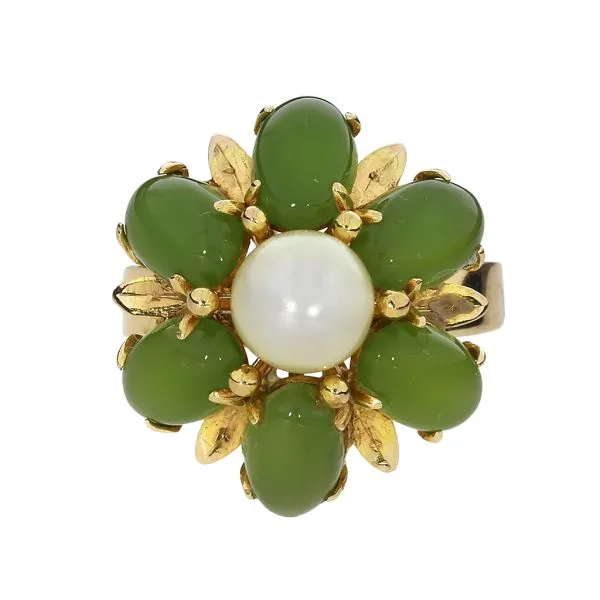 14K Yellow Gold Vintage Nephrite Jade and Pearl Cluster Dome Ring