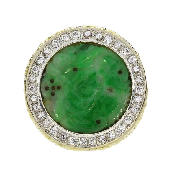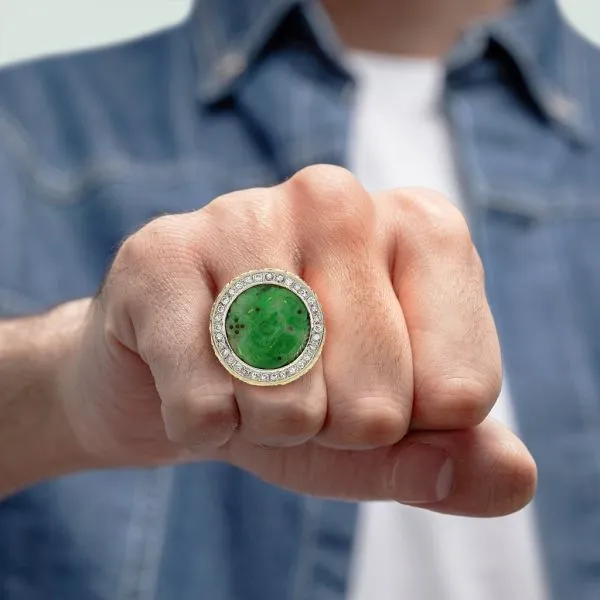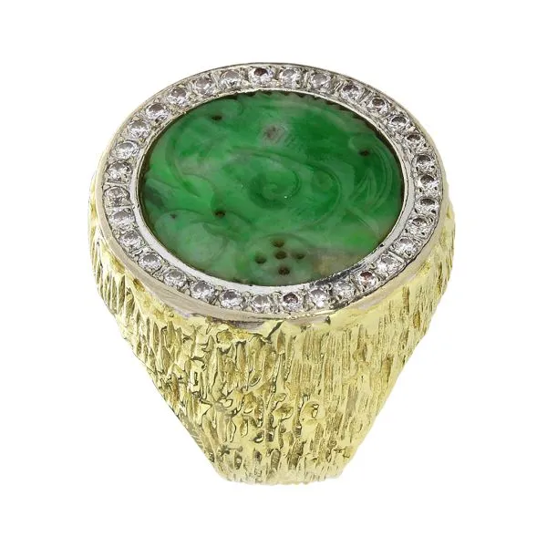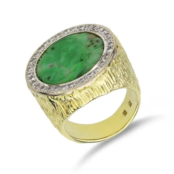 Mens 14K Yellow Gold Carved Jadeite .80ctw Natural Diamond Halo Ring Image 2 Purple Creek Holly Springs, NC