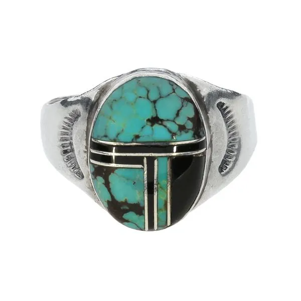 Sterling Silver Native American Vintage Turquoise and Onyx Inlay Ring Image 2 Purple Creek Holly Springs, NC